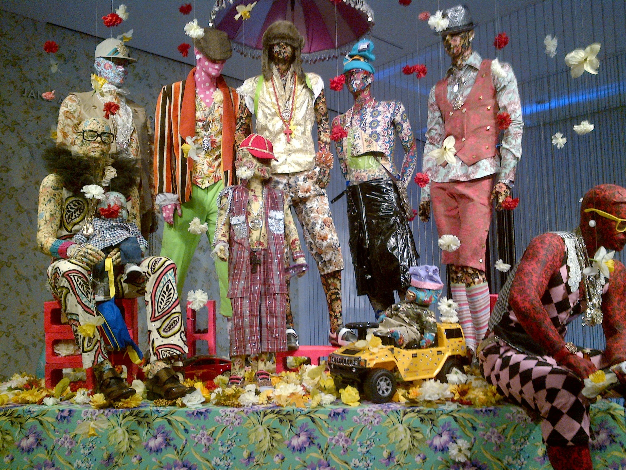 Dead Treez is the first solo New York museum show for Jamaican artist Ebony G. Patterson. There are two parts to this vibrant and moving show; the first gallery features five eye-popping mixed media tapestries with embroidery made up of glitter, glass, silk flowers, lace, gun, hula-hoop, toys. And a life-size tableau of ten male mannequins, dressed in a kaleidoscopic mix of floral fabrics. All looks beautiful, lovely from a distance, but take a closer look and these works are filled with a deep underlying menace and violence which is so profound in disenfranchised postcolonial Jamaica. The second gallery (The Tiffany Jewelry Gallery) is filled with beautiful flowers splashed with jewelry and gorgeous fabrics, but hidden among this bucolic setting are horrific signs from true-life murders. Dead Treez a show so lovely on first gaze, but leaves you numb on leaving.